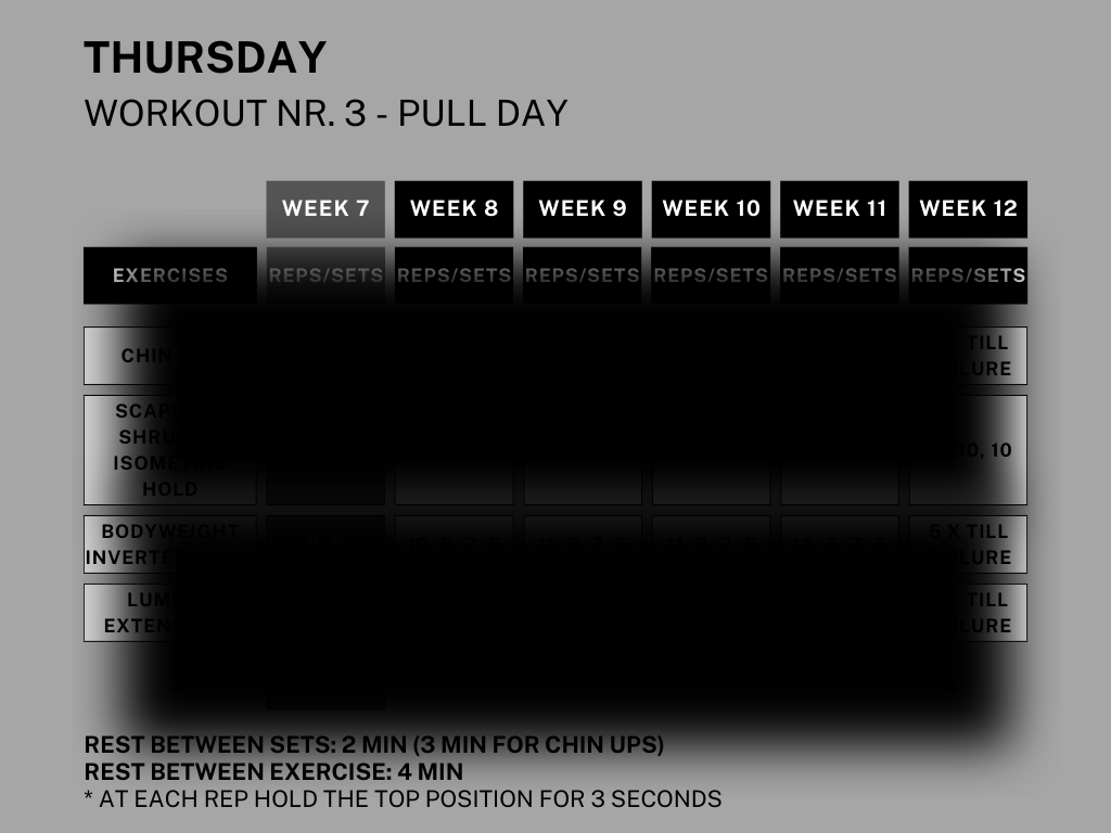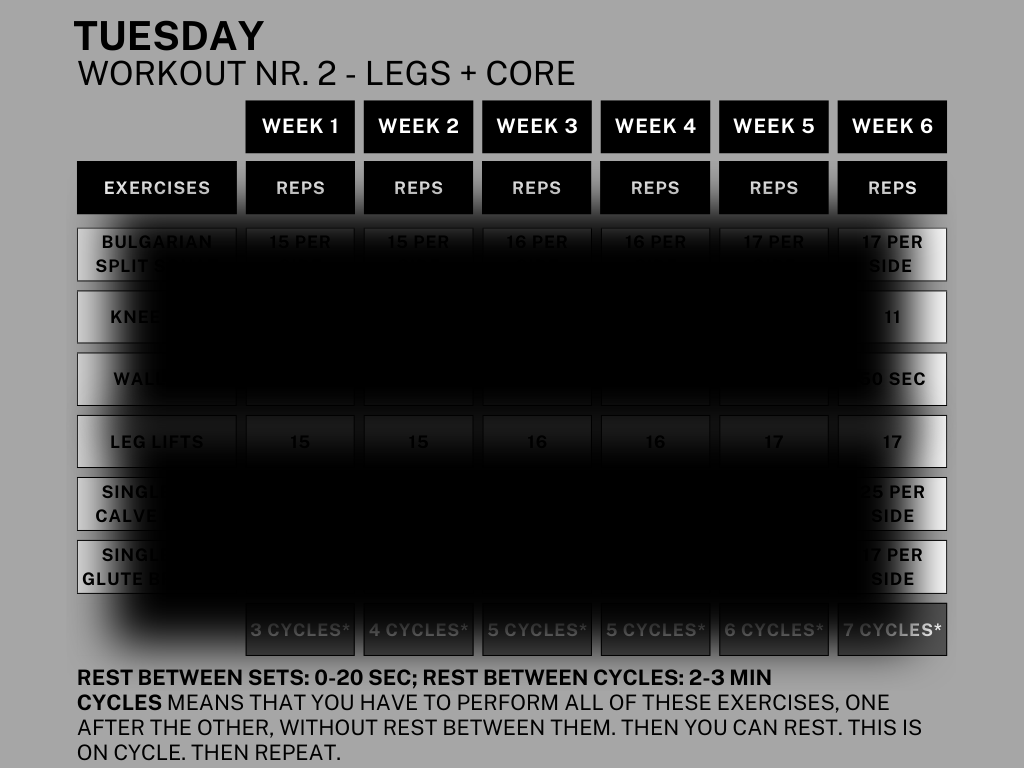 - 4 Structured Workouts Per Week: Target push, pull, legs, and core, focusing on building strength and muscle endurance.